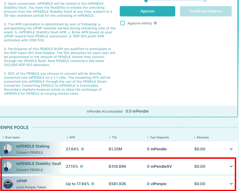 Penpie allows you to convert your PENDLE to mPEDNLE to receive rewards: